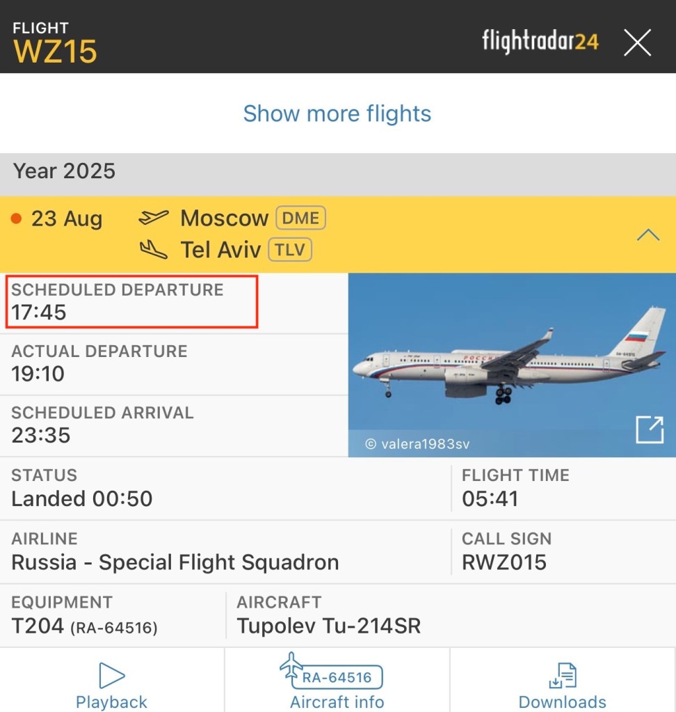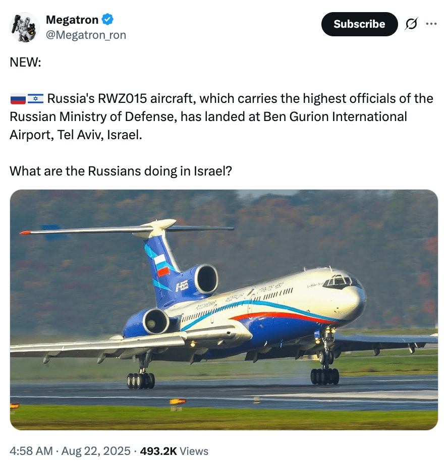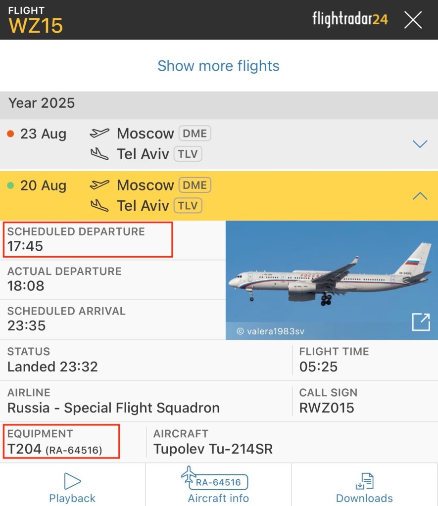 Conspiracy speculation is spreading on the social network X: allegedly, a Russian military plane with high-ranking officials on board twice made secret flights to Tel Aviv. It is stated that the aircraft with tail number RA-64516, identified as a military Tu-214SR, flew to Israel on August 20 and 23 (flight RWZ015).