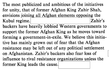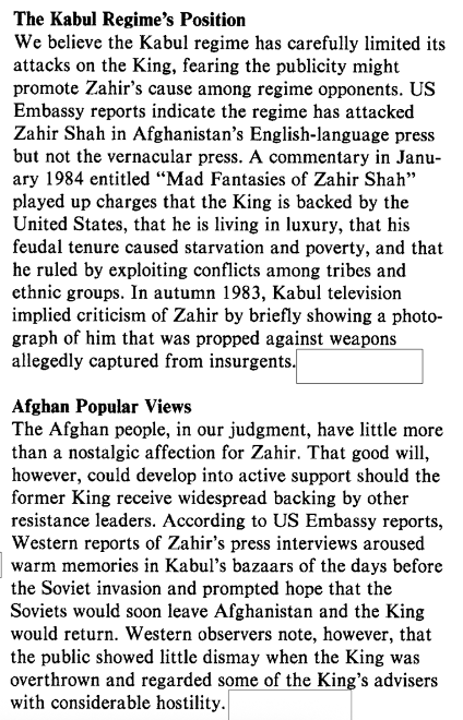 Contrary to Rashid’s blatant lie, a declassified CIA file from 1984 makes no mention of U.S. opposition to the King’s return. In fact, only the USSR, Pakistan, and some mujahideen leaders were opposed to such an initiative.