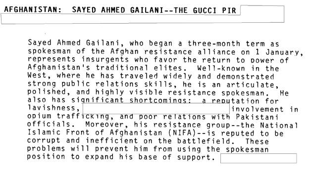 Another declassified CIA document from 1986 notes Sayed Gailani’s positive engagements with Western circles and his “poor relations with Pakistani officials.”