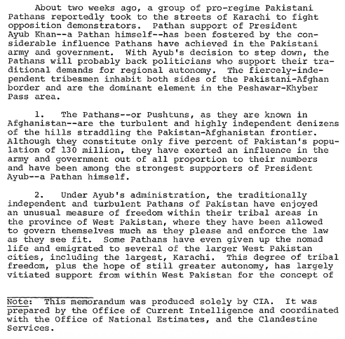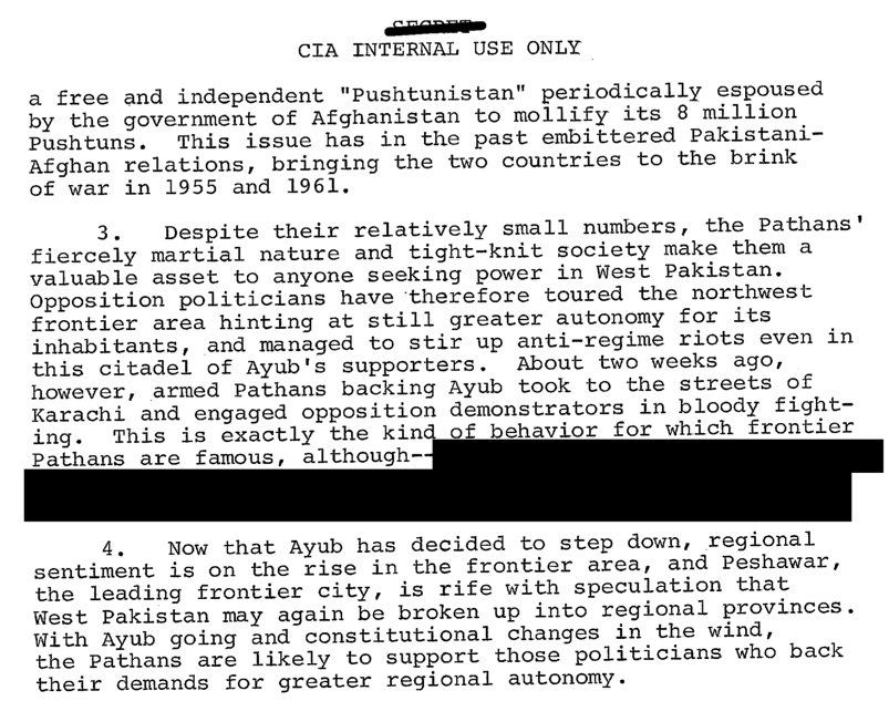 “I would guess that Bhutto has no fear of Ayub anymore that goes beyond mild irritation over such things as the fact that Ayub’s picture is still everywhere in the country. Also, there is little doubt that he is still held in high esteem throughout the countryside.