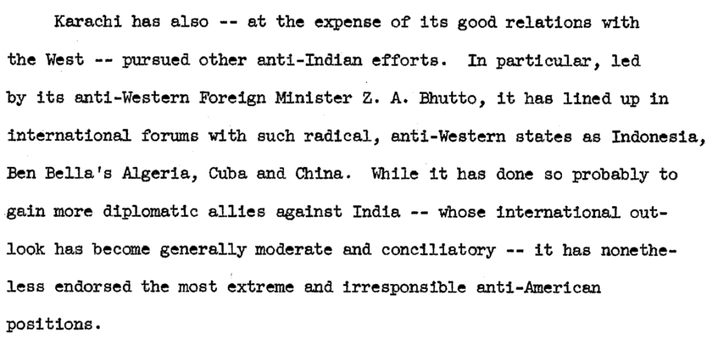 It was also Ayub Khan who appointed “revolutionary” Zulfikar Ali Bhutto as his Foreign Minister. In the wake of India demonstrating that its non-alignment policy by no means, translated into anti-imperialism, Bhutto courted Cuba, Algeria, Indonesia, and China in his diplomatic efforts against our hostile Eastern neighbor.