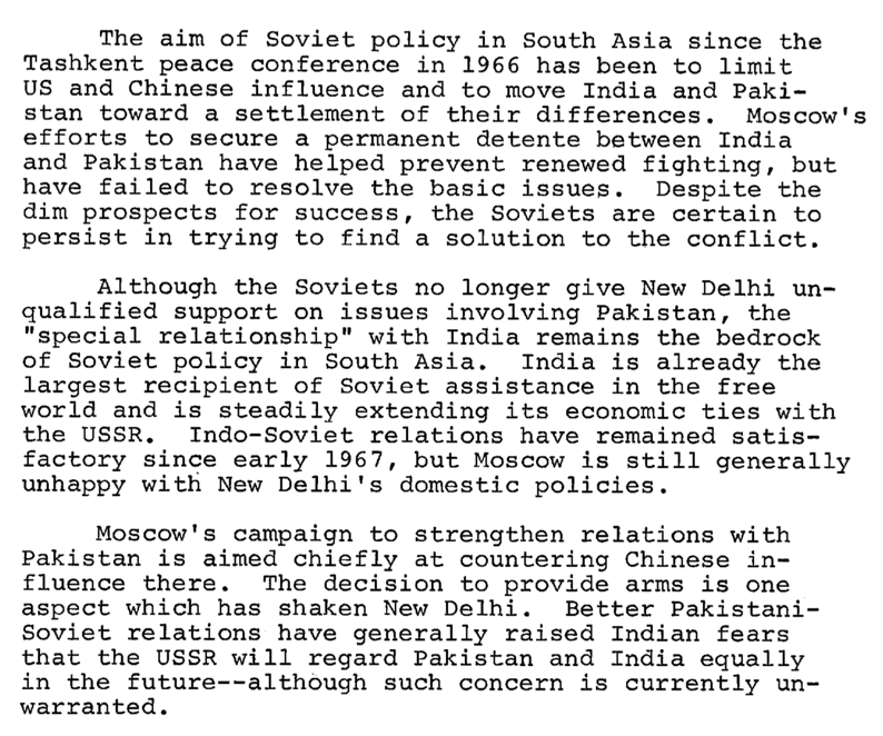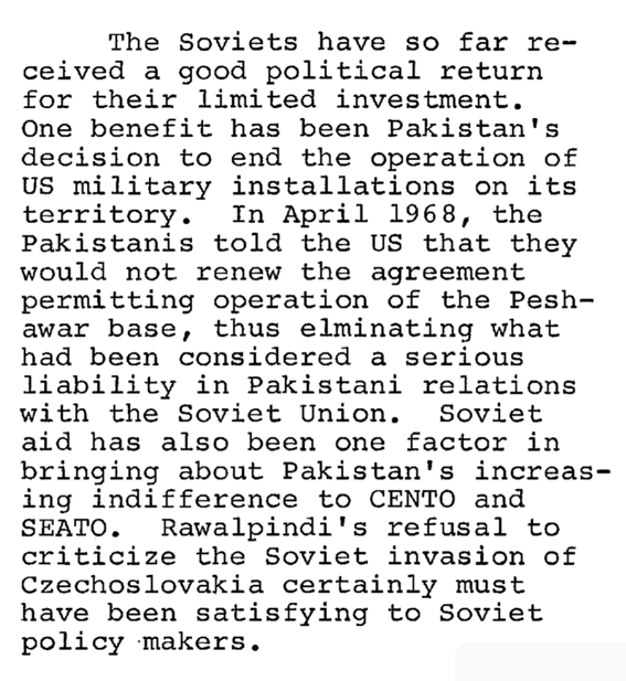 Ayub Khan secured military aid from the Soviet Union—a first in Pakistan’s history. At the time, Soviet policy towards South Asia was driven by concerns about U.S. influence in the region and Pakistan’s growing reliance on communist China. Following the 1966 Tashkent Conference, the USSR adopted a more measured stance on Kashmir, and in 1968, Ayub Khan informed the U.S. that Pakistan would not renew its commitment to the Peshawar base.